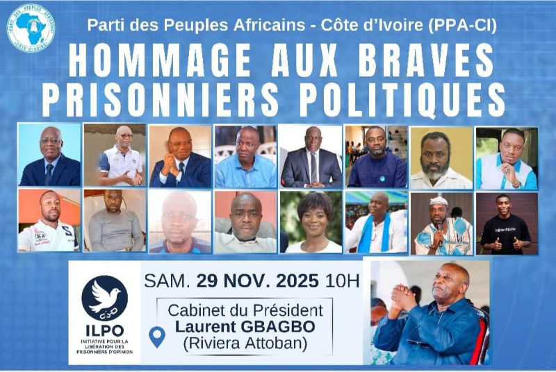 Cette initiative a été lancée le samedi 29 novembre 2025 en présence des messagères du Président Laurent GBAGBO, naguère constituées pour soutenir activement la campagne de l’élection présidentielle du candidat Laurent GBAGBO. Celui-ci ayant été arbitrairement exclu de l’élection présidentielle, ces braves dames et demoiselles, mobilisées sur l’ensemble du territoire national ont répondu avec ferveur à la nouvelle mission qui leur a été confiée par le Président Laurent GBAGBO. Elles se sont désormais engagées dans l’action pour la libération des prisonniers d’opinion dont le nombre a explosé au cours des deux derniers mois. Leur mission sera précisée par la commission de coordination et de suivi de l’ILPO que dirige l’ambassadeur Emmanuel Ackah, Directeur de cabinet du Président Laurent GBAGBO, toute chose qui témoigne de l’importance que ce dernier accorde à cette question. Au-delà des messagères et avant elles cette mission est celle de toute la direction, des militantes et militants du PPA-CI